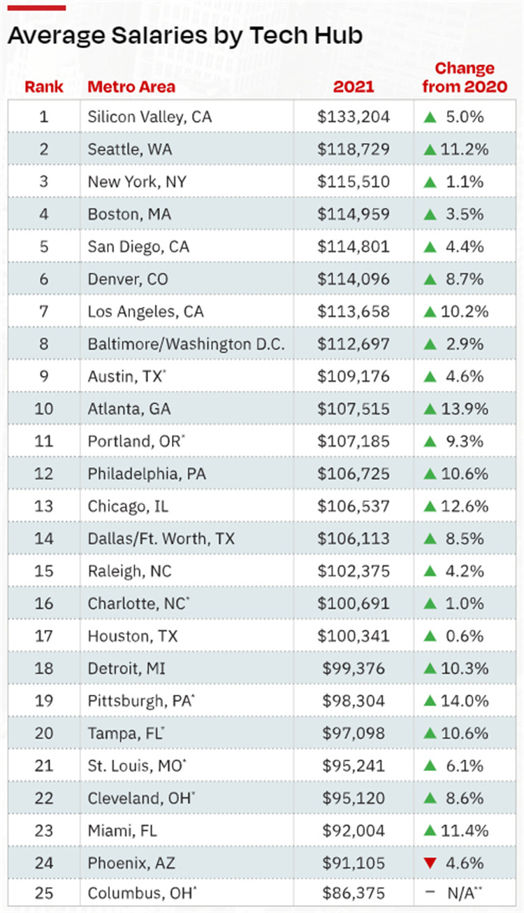 在2020-21年期间,西雅图(增长11.2%)和硅谷(5.0%)的工资显著增长,纽约市(1.1%)和波士顿(3.5%)的工资略有增长,这表明这些成熟的中心城市的需求仍在继续。