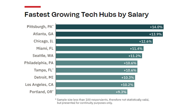 如Z新的Dice薪资报告所述,西雅图和硅谷等成熟的科技中心以及奥斯汀和亚特兰大等新兴城市在过去一年里,其技术人员的薪资都有显著增长。