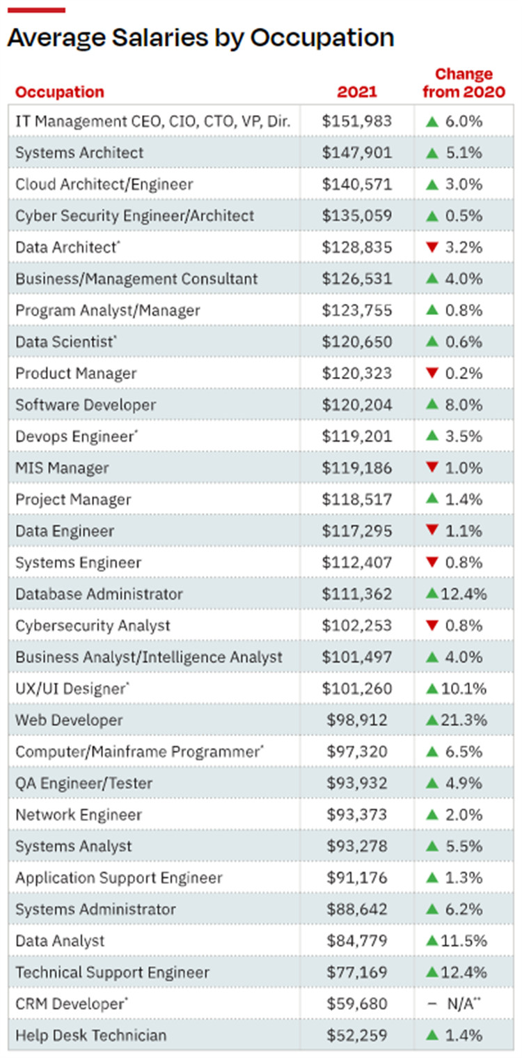 但在2020年至2021年期间,一些高度专业化、需求旺盛的职业的工资也略有下降,例如,网络安全分析师跌0.8%,至102,253美元;数据工程师跌1.1%,至117,295美元,其他“热门”技术专家职位的薪资水平保持不变。