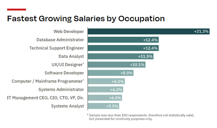 与此类似,系统管理员(6.2%)和系统架构师(5.1%)的薪水每年都有显著的增长,因为企业需要能够在各种环境中构建、维护和扩展技术堆栈的技术人员,其他专注于构建公司网站的技术人员职位,包括软件开发人员(8%)和UI/UX设计师(10.1%),也出现了显著增长。