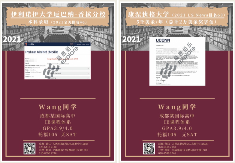 Student Wang's dream school is New York University, and he also chose to apply to New York University through Early Decision. However, due to the pandemic, she was unable to take the SAT exam. With a TOEFL score of 105, she did not have much competitiveness at the highly competitive New York University. Therefore, the school initially placed her on the waiting list. However, we did not want to give up on the student's dream school easily. After communicating with the student, we wrote a sincere application letter and included the academic projects she had done at school in it. As a result, all our efforts paid off and Wang was admitted to her dream school, New York University. In addition, she has also been admitted to UCD, UCSC, the University of Connecticut, UIUC and the University of Toronto.