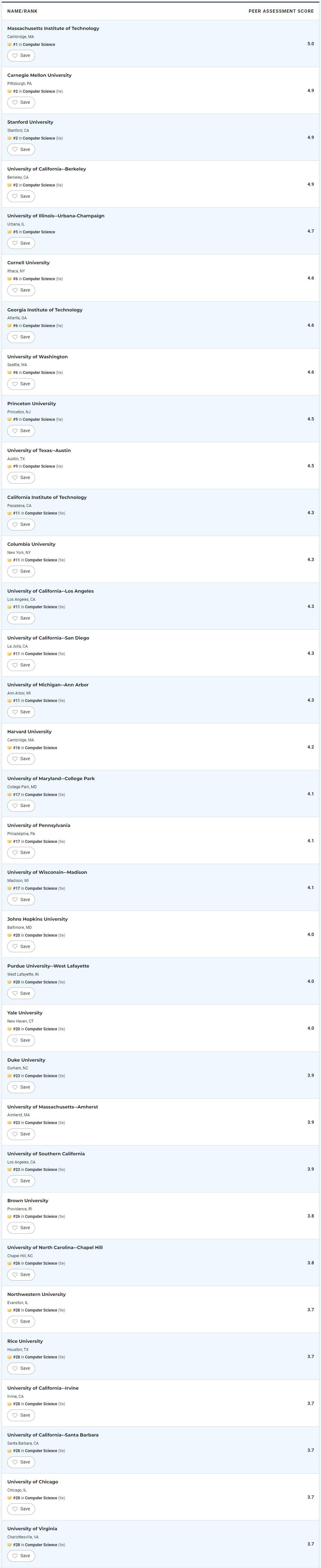 在US NEWS计算机科学硕士项目专业排名中,Top10的学校有: