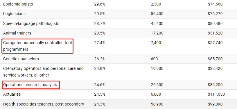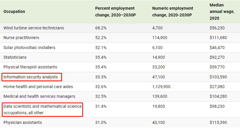 从以上数据来看,除健康领域外,计算机和数学相关的工作预计会出现高增长,BLS预计,IT安全和软件开发的需求会非常大。