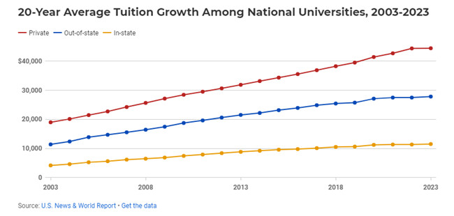 赴美读书,学费和生活费是家长关心的问题之一。2023-2024学年,美国大学学费节节攀升,绝大部分学校的学费都有所上涨,而且增幅均超过4%。这一增长将不少美国TOP院校的本科学年学费推向了另一个关口:9万美元!