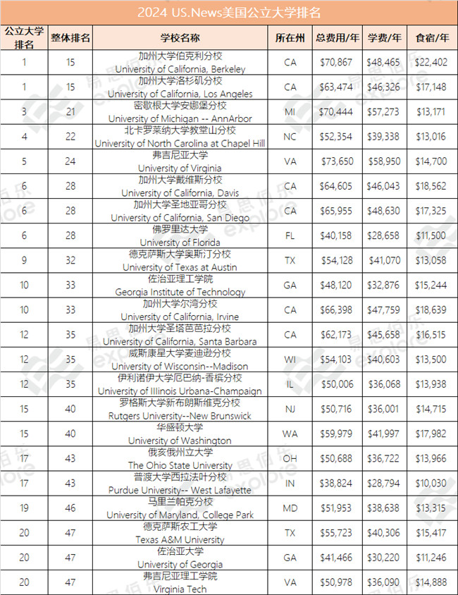 就读美国公立大学本科一年要花多少钱?我们做了一个详细的汇总,列出2023-2024学年美国排名前50的公立大学州外学生一学年学费和生活费,供大家参考。
