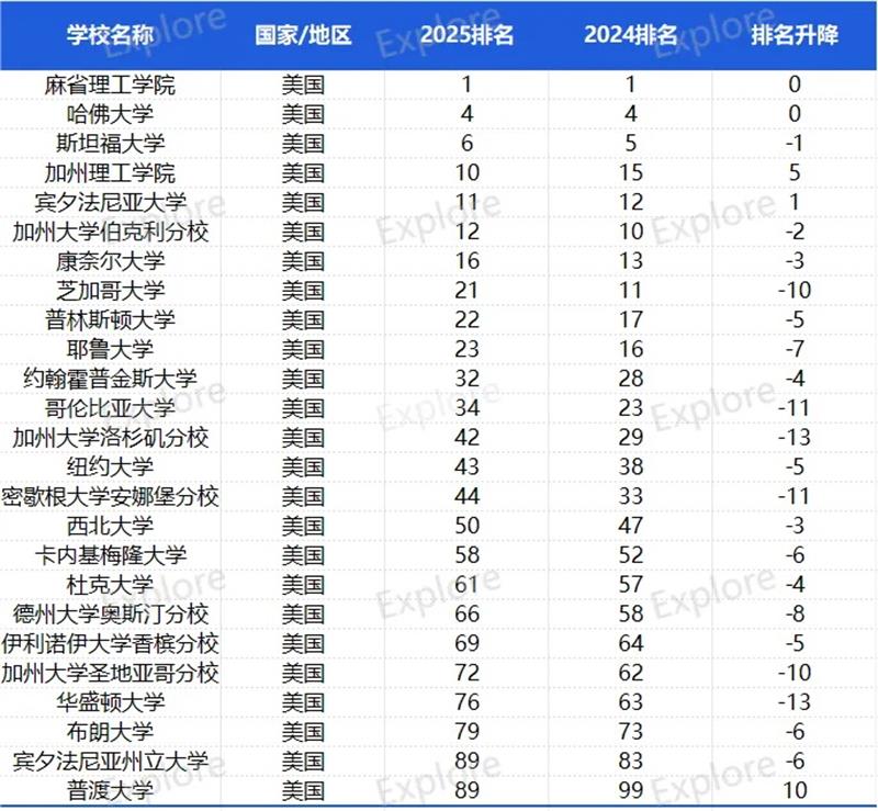 麻省理工学院连续13年位列世界第 1,其余几所则为:哈佛大学(#4)、斯坦福大学(#6)、加州理工学院(#10)。QS官方表示:美国依然成功保持了在雇主和学术界的良好声誉。