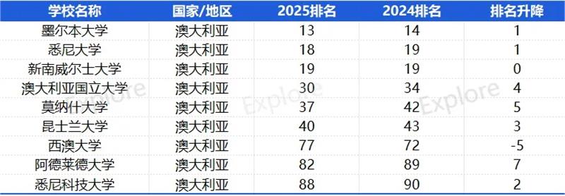 澳大利亚国立大学(#30)、莫纳什大学(#37)、昆士兰大学(#40)、阿德莱德大学(#82)、悉尼科技大学(#88)。西澳大学:我没惹你们任何人。