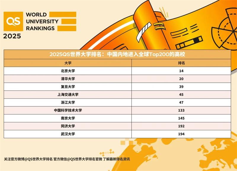 中国内地学府的排名提升,有68%的中国内地大学排名上涨,有5所中国内地高校跻身全球前50,9所进入全球前200。