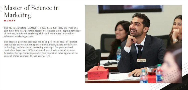 The Master of Marketing program is offered under its business school. The program aims to help students apply the marketing knowledge they have learned to address the real-world challenges faced by organizations of all sizes. Through the intensive courses of this program, students will integrate insights into consumer behavior, big data, analytics, new technologies, and persuasion psychology to reveal the inner workings of contemporary marketing.