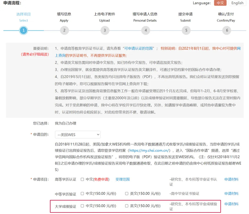 If you complete WES first, be sure to remember that you also need to complete the English transcript verification report on the China Higher Education Student Information Network (Chsi.com.cn). Then, send the Chinese and English transcripts as well as the grade verification report to WES through Chsi.com.cn.