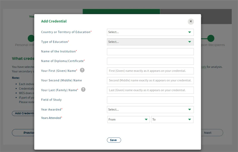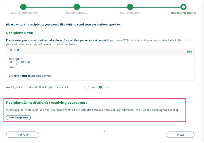Add Recipients to provide specific school information. If you haven't determined the school to send your transcript to during WES verification, you can skip it and send it after the school requests it. The shipping fee for each additional copy is $33.