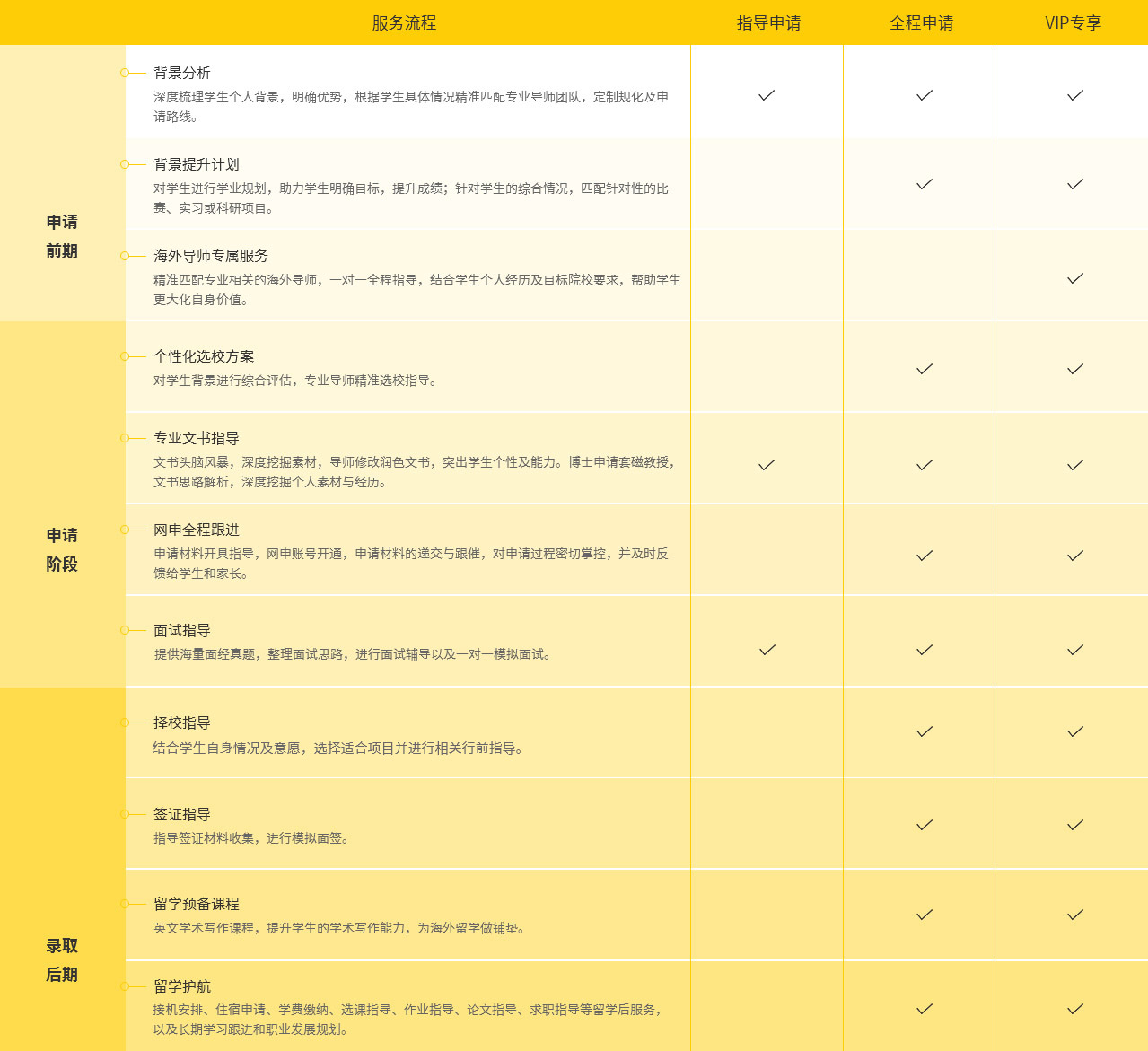 The entire process of studying abroad application, including software and hardware background enhancement, school selection and selection, document creation, application follow-up, interview coaching, visa processing, etc., provides strong support for overseas applications.